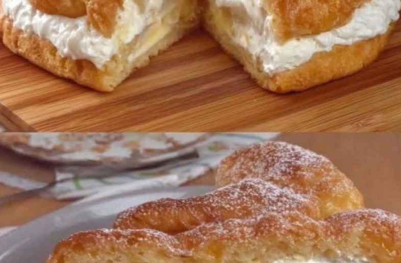 This elegant French dessert, Paris-Brest, is a ring of baked pâte à choux (choux pastry) often shaped like a bicycle wheel, filled with rich crème pâtissière (custard) and light whipped cream.