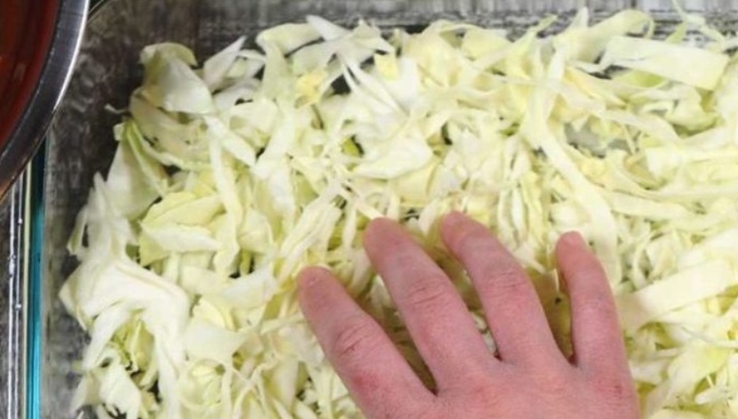 Slowly pour the beef broth over the casserole. This cooks the rice and tenderizes the cabbage. Cover tightly with foil.