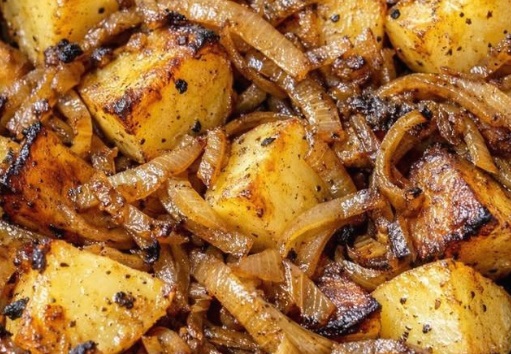What to look for: The potatoes should be tender inside with crispy edges, and the onions should be soft and golden brown.
