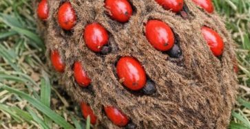 Found this strange fuzzy cone under my tree with bright red berries sticking out of it.
