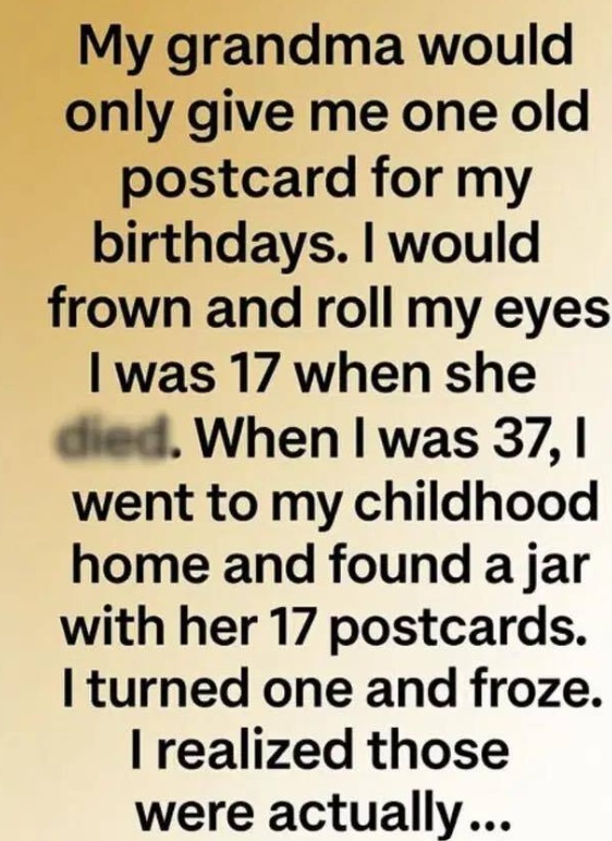 Every year on my birthday, she gave me the same thing: a single, old postcard. No envelope stuffed with cash. No carefully wrapped box. Just a postcard—sometimes faded, sometimes bent, always handwritten. As a teenager, I found it embarrassing. I rolled my eyes, thanked her politely, and tucked it away without a second thought.
