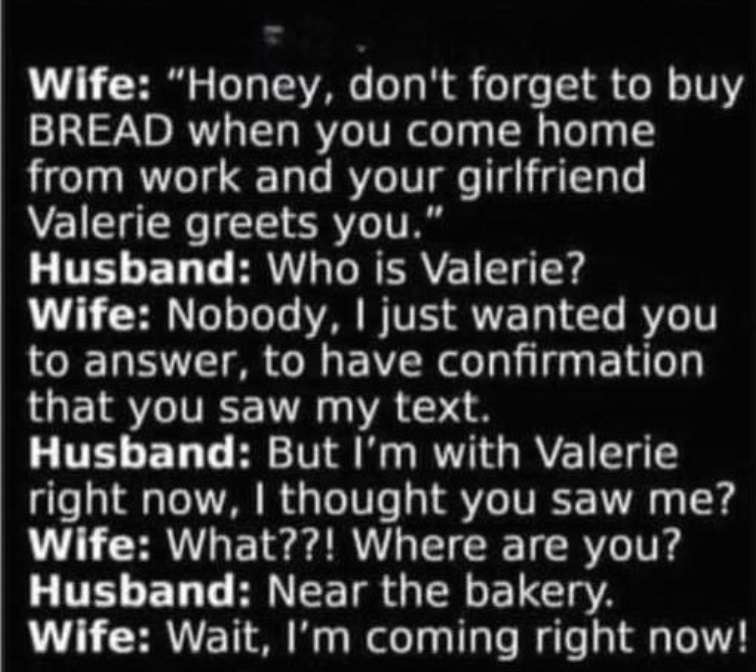 “Honey, don’t forget to buy bread when you come home from work—and say hi to your girlfriend Valerie.”