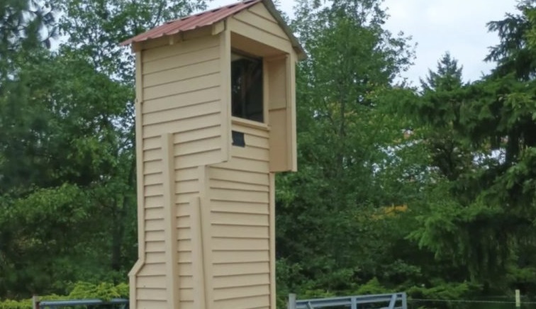 With its beige siding and pitched roof, the structure fits seamlessly into rural landscapes. It resembles a mix between a small watchtower and a birdhouse, catching the eye of curious passersby who speculate: “Is that a mini fire tower?” or “Could it be a fancy chicken coop?”
